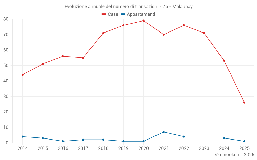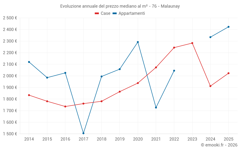 Il prezzo mediano sulle 26 transazioni di case degli ultimi 6 mesi nel comune di Malaunay era di 2 023 € al metro quadrato per un valore patrimoniale mediano di 172 175 €. In questo periodo il 60% delle transazioni era tra 1 583 e 2 273 € al metro quadrato (dal 2° all'8° decile).