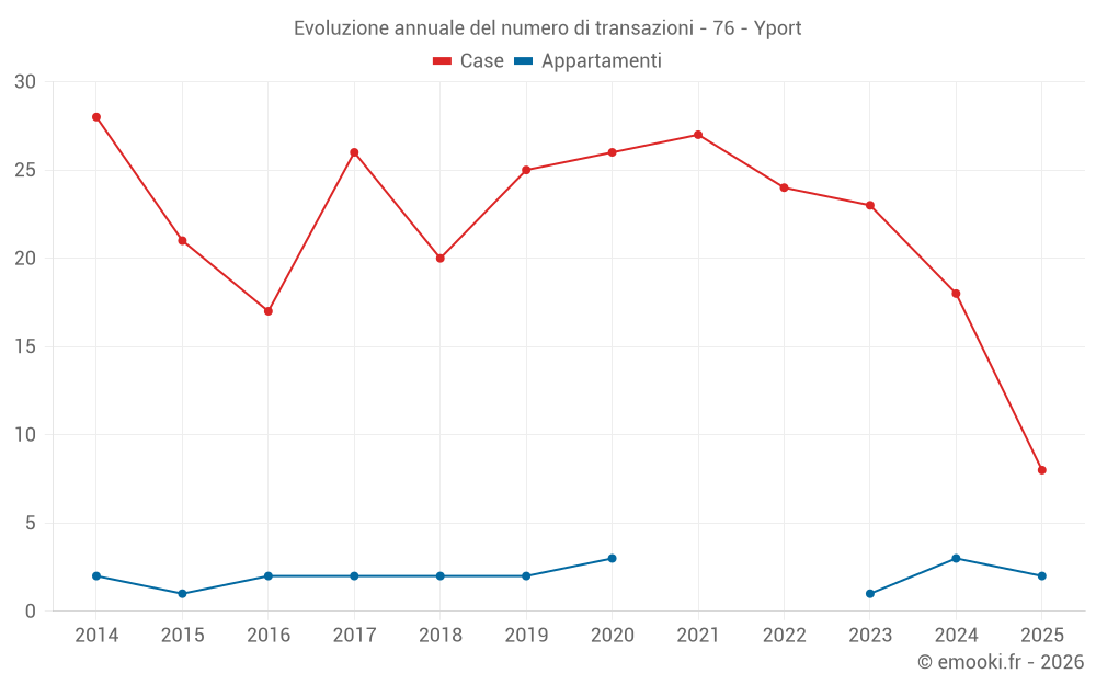 Il prezzo mediano sulle 18 transazioni di case degli ultimi 12 mesi nel comune di Yport era di 2 932 € al metro quadrato per un valore patrimoniale mediano di 197 500 €. In questo periodo il 60% delle transazioni era tra 1 776 e 5 204 € al metro quadrato (dal 2° all'8° decile).