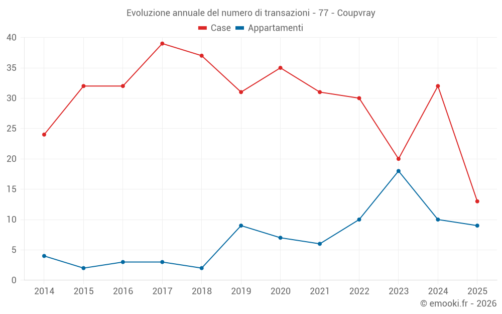 Il prezzo mediano sulle 29 transazioni di appartamenti degli ultimi 24 mesi nel comune di Coupvray era di 4 020 € al metro quadrato per un valore patrimoniale mediano di 231 000 €. In questo periodo il 60% delle transazioni era tra 3 712 e 4 686 € al metro quadrato (dal 2° all'8° decile).
