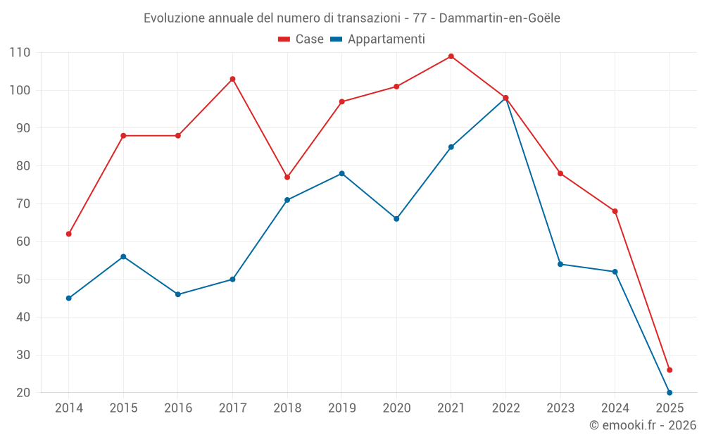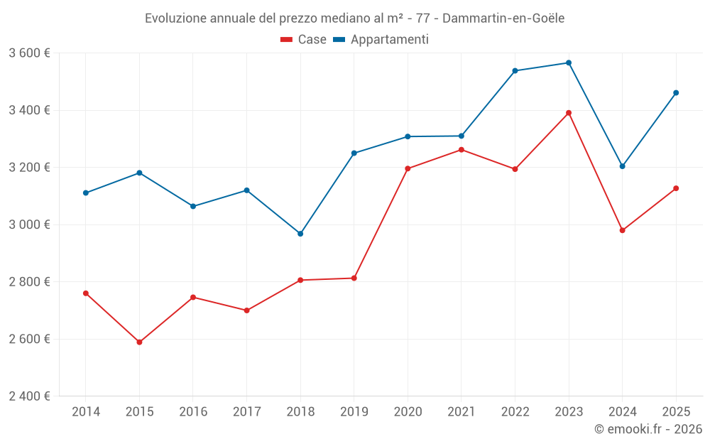 Il prezzo mediano sulle 20 transazioni di appartamenti degli ultimi 6 mesi nel comune di Dammartin-en-Goële era di 3 461 € al metro quadrato per un valore patrimoniale mediano di 149 500 €. In questo periodo il 60% delle transazioni era tra 3 069 e 3 669 € al metro quadrato (dal 2° all'8° decile).