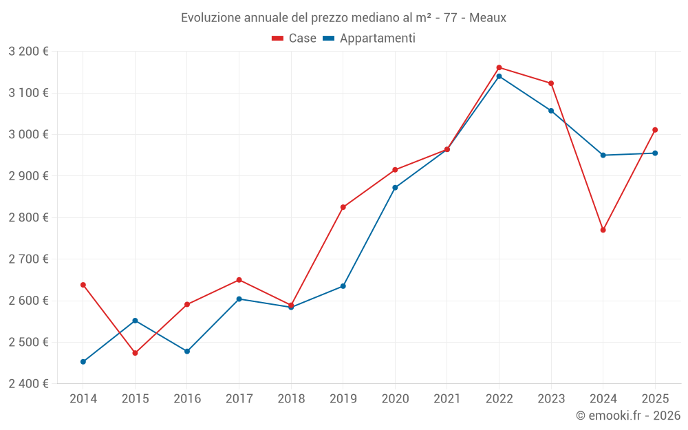 Il prezzo mediano sulle 51 transazioni di appartamenti degli ultimi 3 mesi nel comune di Meaux era di 2 961 € al metro quadrato per un valore patrimoniale mediano di 145 000 €. In questo periodo il 60% delle transazioni era tra 2 385 e 3 545 € al metro quadrato (dal 2° all'8° decile).