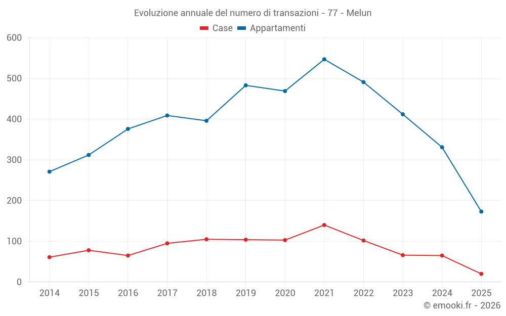 Il prezzo mediano sulle 70 transazioni di appartamenti degli ultimi 3 mesi nel comune di Melun era di 2 616 € al metro quadrato per un valore patrimoniale mediano di 117 250 €. In questo periodo il 60% delle transazioni era tra 1 961 e 3 081 € al metro quadrato (dal 2° all'8° decile).