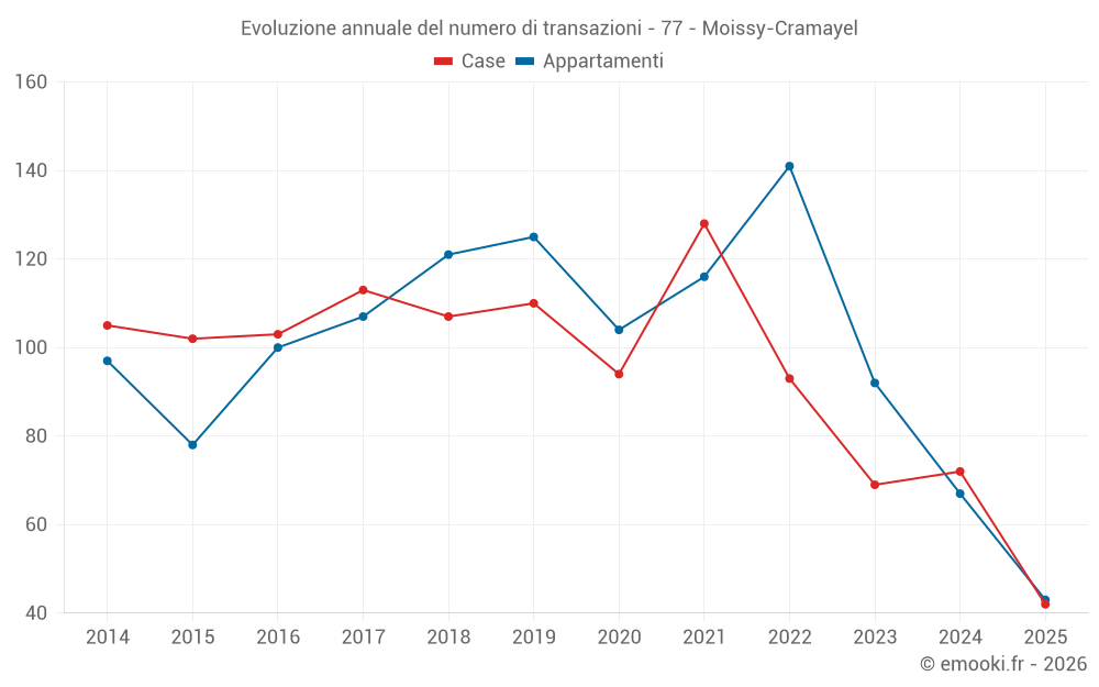 Il prezzo mediano sulle 43 transazioni di appartamenti degli ultimi 6 mesi nel comune di Moissy-Cramayel era di 3 102 € al metro quadrato per un valore patrimoniale mediano di 160 000 €. In questo periodo il 60% delle transazioni era tra 2 630 e 3 425 € al metro quadrato (dal 2° all'8° decile).