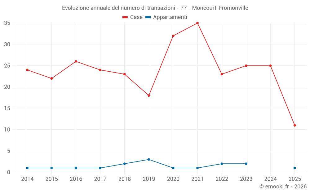 Il prezzo mediano sulle 28 transazioni di case degli ultimi 12 mesi nel comune di Moncourt-Fromonville era di 2 598 € al metro quadrato per un valore patrimoniale mediano di 252 500 €. In questo periodo il 60% delle transazioni era tra 1 730 e 3 165 € al metro quadrato (dal 2° all'8° decile).