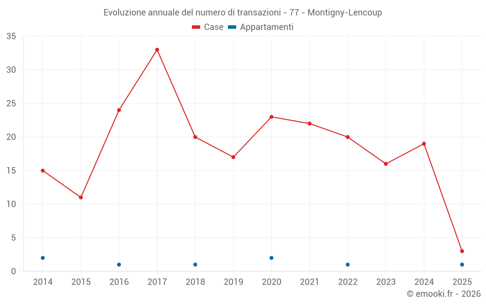 Il prezzo mediano sulle 28 transazioni di case degli ultimi 24 mesi nel comune di Montigny-Lencoup era di 2 020 € al metro quadrato per un valore patrimoniale mediano di 174 000 €. In questo periodo il 60% delle transazioni era tra 1 187 e 2 643 € al metro quadrato (dal 2° all'8° decile).