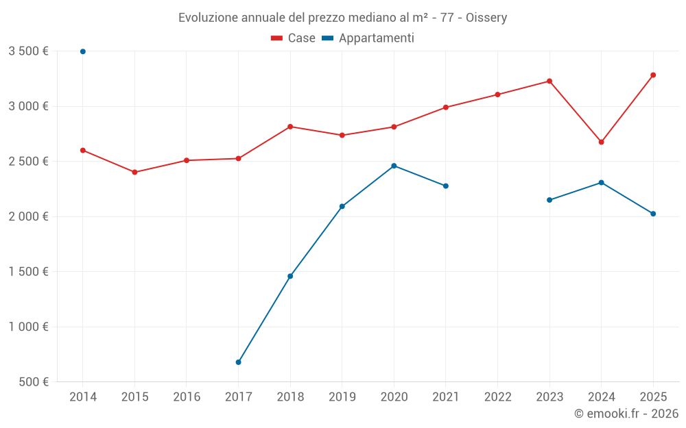 Il prezzo mediano sulle 17 transazioni di case degli ultimi 12 mesi nel comune di Oissery era di 3 157 € al metro quadrato per un valore patrimoniale mediano di 303 000 €. In questo periodo il 60% delle transazioni era tra 2 205 e 3 830 € al metro quadrato (dal 2° all'8° decile).