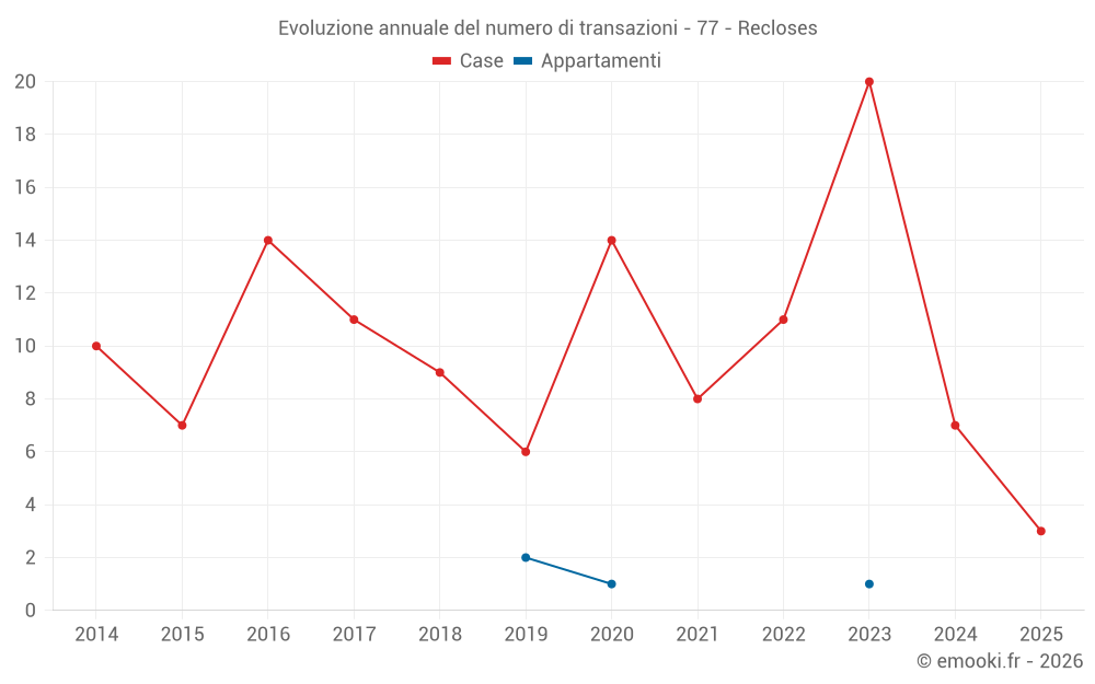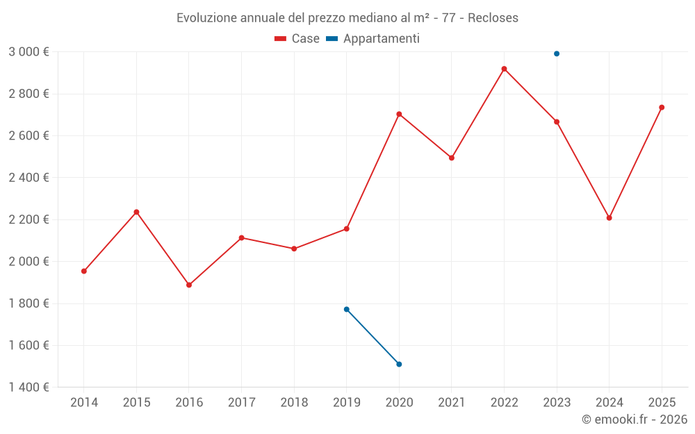 Il prezzo mediano sulle 17 transazioni di case degli ultimi 24 mesi nel comune di Recloses era di 2 735 € al metro quadrato per un valore patrimoniale mediano di 288 000 €. In questo periodo il 60% delle transazioni era tra 1 453 e 3 377 € al metro quadrato (dal 2° all'8° decile).