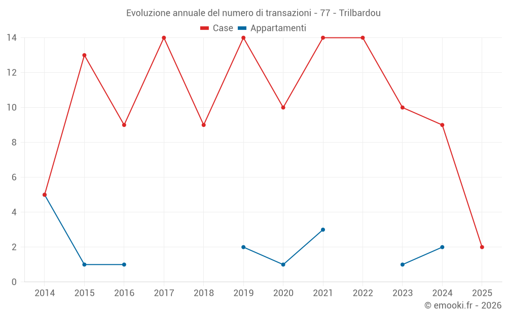 Il prezzo mediano sulle 17 transazioni di case degli ultimi 24 mesi nel comune di Trilbardou era di 2 444 € al metro quadrato per un valore patrimoniale mediano di 213 000 €. In questo periodo il 60% delle transazioni era tra 1 198 e 3 003 € al metro quadrato (dal 2° all'8° decile).