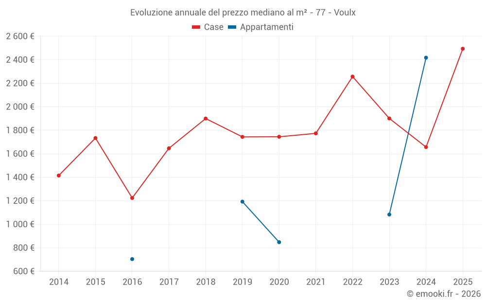 Il prezzo mediano sulle 22 transazioni di case degli ultimi 12 mesi nel comune di Voulx era di 1 878 € al metro quadrato per un valore patrimoniale mediano di 169 500 €. In questo periodo il 60% delle transazioni era tra 1 029 e 2 631 € al metro quadrato (dal 2° all'8° decile).
