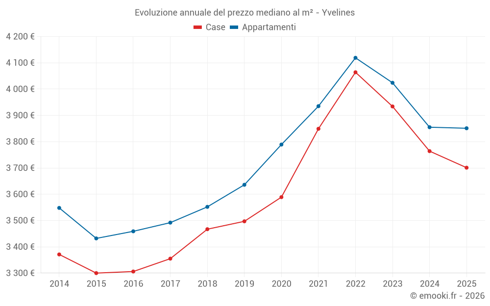 Il prezzo mediano sulle 1372 transazioni di appartamenti degli ultimi 3 mesi nel dipartimento di Yvelines era di 3 866 € al metro quadrato per un valore patrimoniale mediano di 219 025 €. In questo periodo il 60% delle transazioni era tra 2 750 e 5 468 € al metro quadrato (dal 2° all'8° decile).
