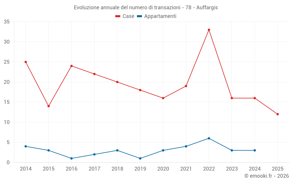 Il prezzo mediano sulle 25 transazioni di case degli ultimi 12 mesi nel comune di Auffargis era di 3 049 € al metro quadrato per un valore patrimoniale mediano di 380 200 €. In questo periodo il 60% delle transazioni era tra 2 393 e 4 263 € al metro quadrato (dal 2° all'8° decile).