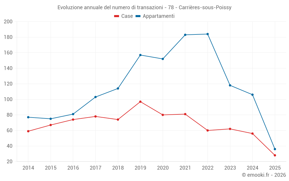 Il prezzo mediano sulle 28 transazioni di case degli ultimi 6 mesi nel comune di Carrières-sous-Poissy era di 3 562 € al metro quadrato per un valore patrimoniale mediano di 340 000 €. In questo periodo il 60% delle transazioni era tra 3 056 e 3 974 € al metro quadrato (dal 2° all'8° decile).