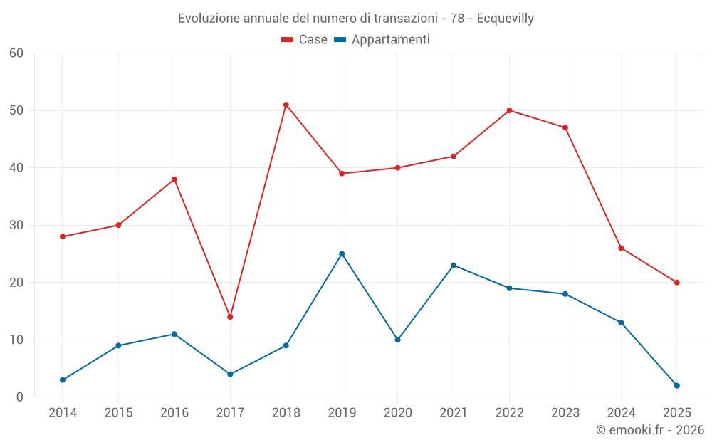 Il prezzo mediano sulle 20 transazioni di case degli ultimi 6 mesi nel comune di Ecquevilly era di 3 179 € al metro quadrato per un valore patrimoniale mediano di 284 500 €. In questo periodo il 60% delle transazioni era tra 2 727 e 3 819 € al metro quadrato (dal 2° all'8° decile).