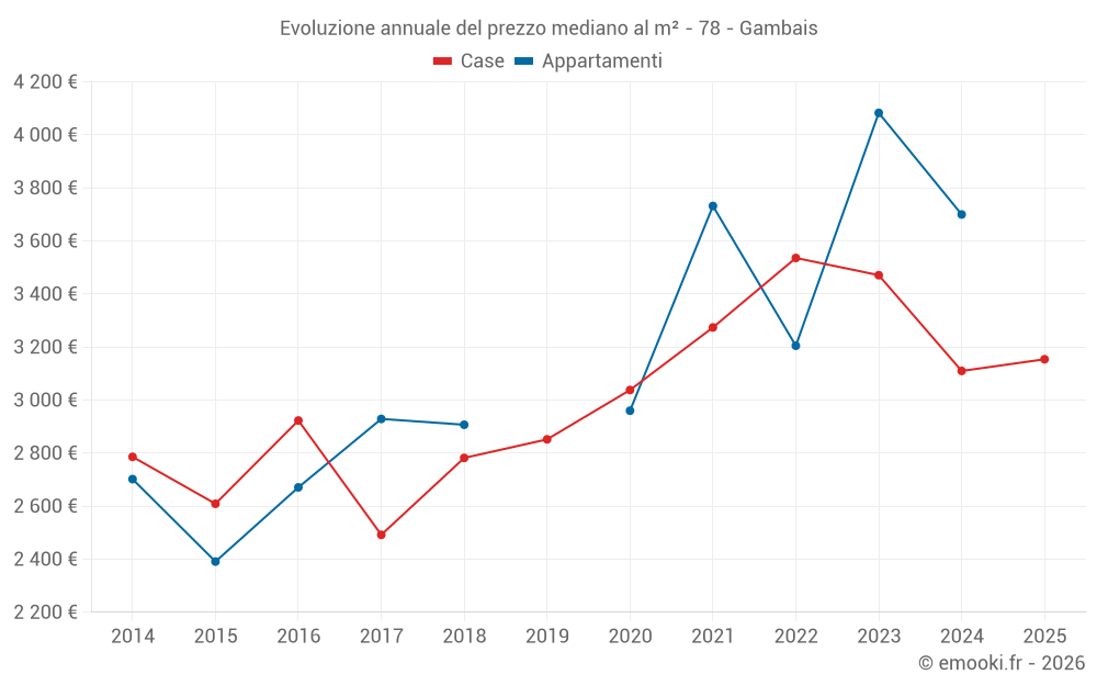 Il prezzo mediano sulle 22 transazioni di case degli ultimi 12 mesi nel comune di Gambais era di 3 132 € al metro quadrato per un valore patrimoniale mediano di 355 500 €. In questo periodo il 60% delle transazioni era tra 2 626 e 3 968 € al metro quadrato (dal 2° all'8° decile).