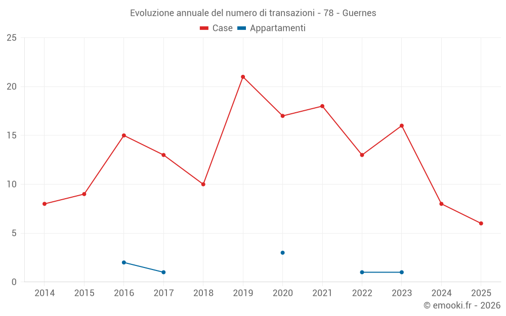 Il prezzo mediano sulle 23 transazioni di case degli ultimi 24 mesi nel comune di Guernes era di 2 500 € al metro quadrato per un valore patrimoniale mediano di 220 000 €. In questo periodo il 60% delle transazioni era tra 1 906 e 2 855 € al metro quadrato (dal 2° all'8° decile).