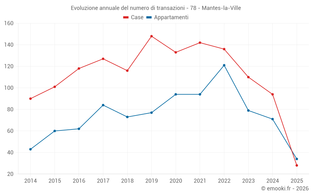 Il prezzo mediano sulle 28 transazioni di case degli ultimi 6 mesi nel comune di Mantes-la-Ville era di 2 426 € al metro quadrato per un valore patrimoniale mediano di 219 325 €. In questo periodo il 60% delle transazioni era tra 2 187 e 2 717 € al metro quadrato (dal 2° all'8° decile).
