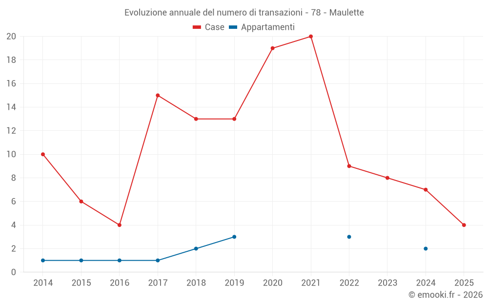 Il prezzo mediano sulle 17 transazioni di case degli ultimi 24 mesi nel comune di Maulette era di 3 448 € al metro quadrato per un valore patrimoniale mediano di 330 000 €. In questo periodo il 60% delle transazioni era tra 2 532 e 3 737 € al metro quadrato (dal 2° all'8° decile).