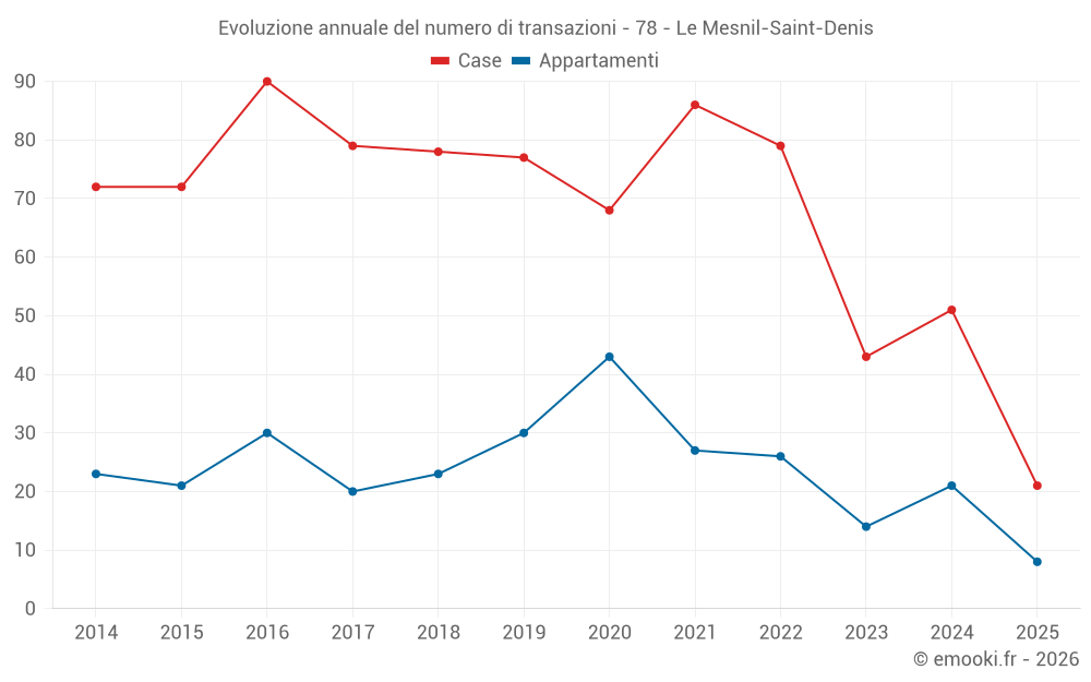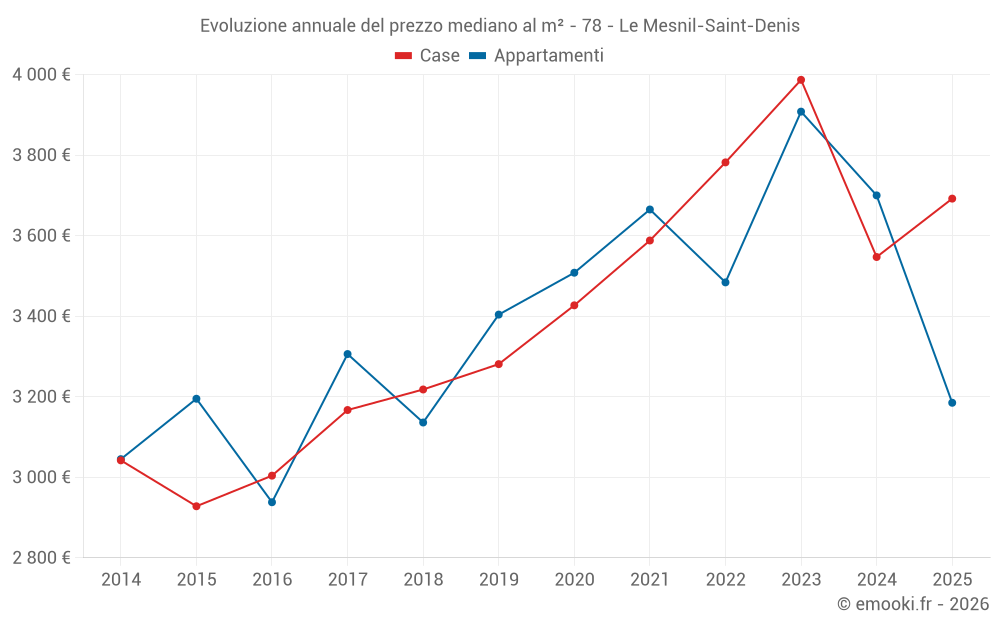 Il prezzo mediano sulle 20 transazioni di appartamenti degli ultimi 12 mesi nel comune di Le Mesnil-Saint-Denis era di 3 380 € al metro quadrato per un valore patrimoniale mediano di 228 550 €. In questo periodo il 60% delle transazioni era tra 2 982 e 3 786 € al metro quadrato (dal 2° all'8° decile).