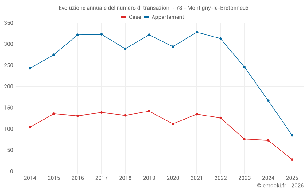Il prezzo mediano sulle 32 transazioni di appartamenti degli ultimi 3 mesi nel comune di Montigny-le-Bretonneux era di 3 375 € al metro quadrato per un valore patrimoniale mediano di 213 780 €. In questo periodo il 60% delle transazioni era tra 2 746 e 4 171 € al metro quadrato (dal 2° all'8° decile).