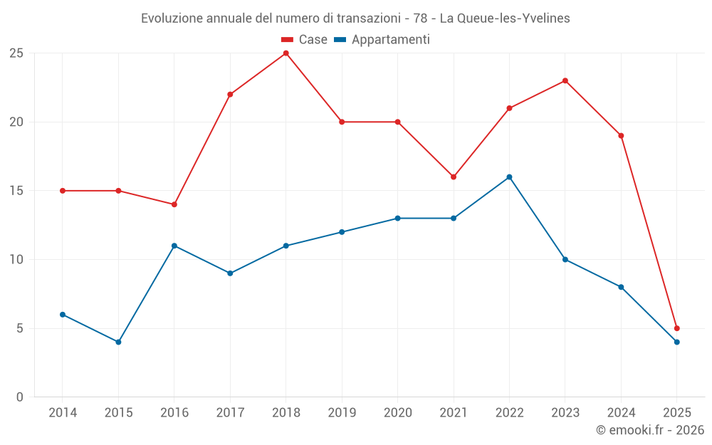 Il prezzo mediano sulle 19 transazioni di appartamenti degli ultimi 24 mesi nel comune di La Queue-les-Yvelines era di 3 889 € al metro quadrato per un valore patrimoniale mediano di 185 000 €. In questo periodo il 60% delle transazioni era tra 3 047 e 4 260 € al metro quadrato (dal 2° all'8° decile).