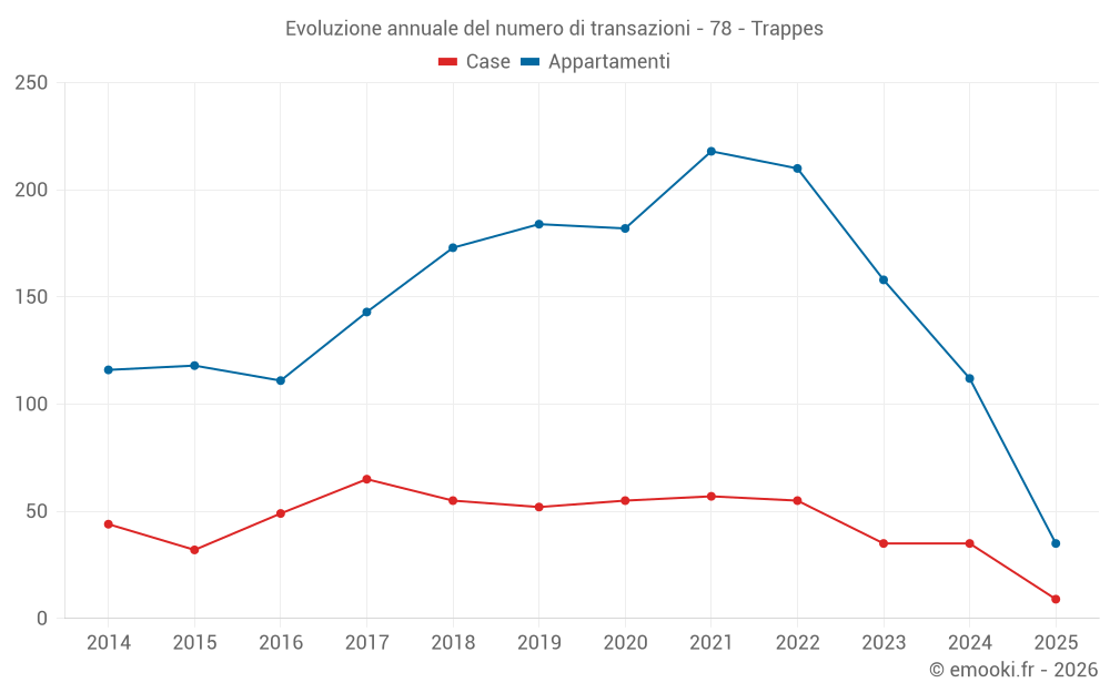 Il prezzo mediano sulle 34 transazioni di case degli ultimi 12 mesi nel comune di Trappes era di 3 285 € al metro quadrato per un valore patrimoniale mediano di 307 100 €. In questo periodo il 60% delle transazioni era tra 2 751 e 4 130 € al metro quadrato (dal 2° all'8° decile).