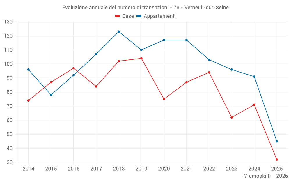 Il prezzo mediano sulle 23 transazioni di appartamenti degli ultimi 3 mesi nel comune di Verneuil-sur-Seine era di 3 548 € al metro quadrato per un valore patrimoniale mediano di 211 300 €. In questo periodo il 60% delle transazioni era tra 2 690 e 4 250 € al metro quadrato (dal 2° all'8° decile).