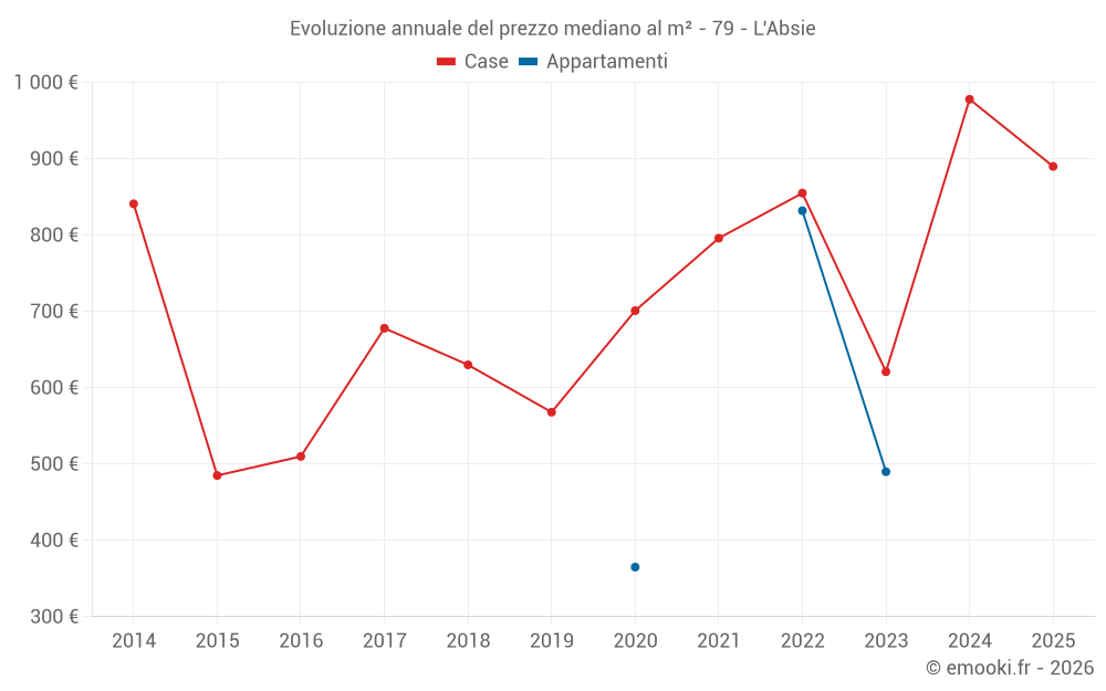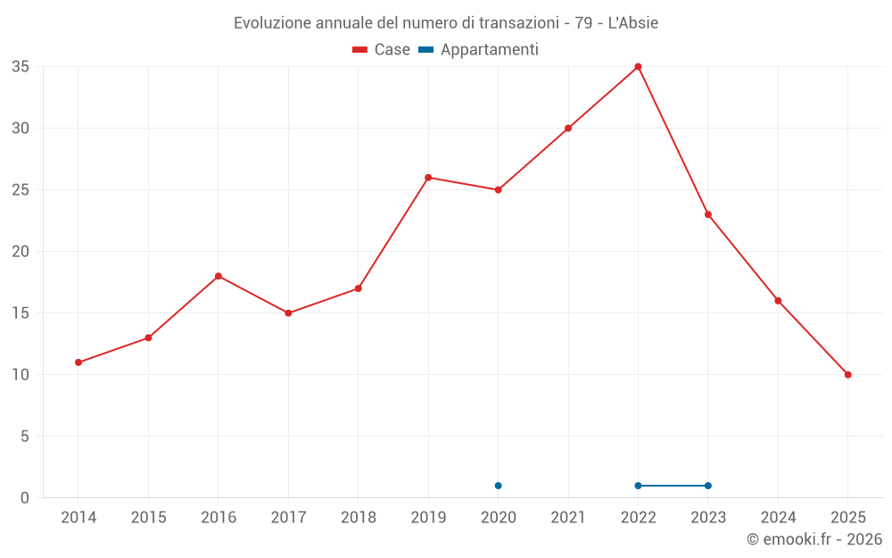 Il prezzo mediano sulle 16 transazioni di case degli ultimi 12 mesi nel comune di L'Absie era di 932 € al metro quadrato per un valore patrimoniale mediano di 91 075 €. In questo periodo il 60% delle transazioni era tra 538 e 1 146 € al metro quadrato (dal 2° all'8° decile).
