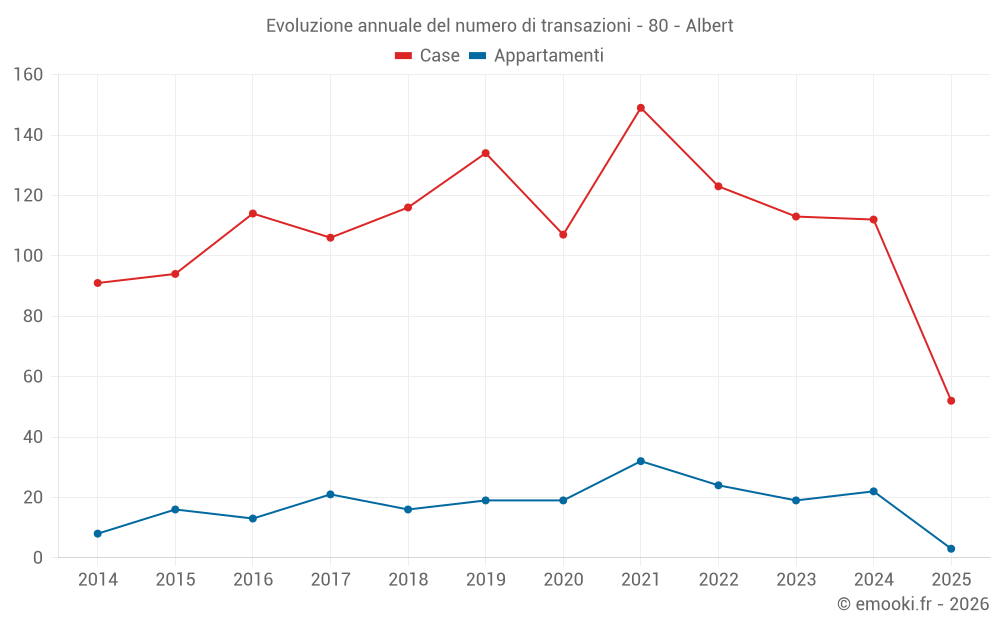 Il prezzo mediano sulle 22 transazioni di case degli ultimi 3 mesi nel comune di Albert era di 1 315 € al metro quadrato per un valore patrimoniale mediano di 100 188 €. In questo periodo il 60% delle transazioni era tra 978 e 1 674 € al metro quadrato (dal 2° all'8° decile).