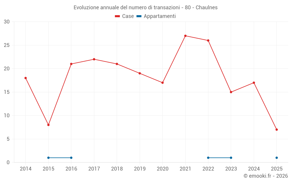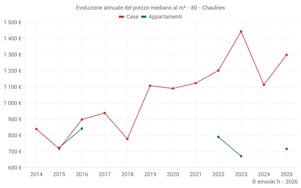 Il prezzo mediano sulle 19 transazioni di case degli ultimi 12 mesi nel comune di Chaulnes era di 1 114 € al metro quadrato per un valore patrimoniale mediano di 105 000 €. In questo periodo il 60% delle transazioni era tra 880 e 1 495 € al metro quadrato (dal 2° all'8° decile).
