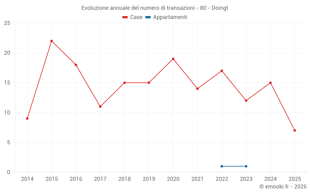Il prezzo mediano sulle 29 transazioni di case degli ultimi 24 mesi nel comune di Doingt era di 1 332 € al metro quadrato per un valore patrimoniale mediano di 140 000 €. In questo periodo il 60% delle transazioni era tra 929 e 1 960 € al metro quadrato (dal 2° all'8° decile).