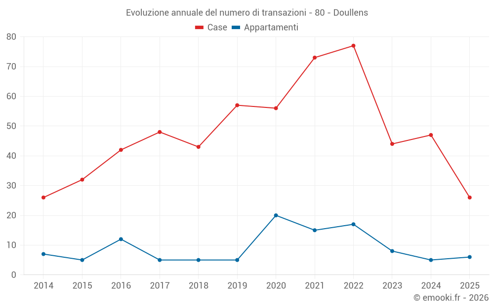 Il prezzo mediano sulle 26 transazioni di case degli ultimi 6 mesi nel comune di Doullens era di 1 339 € al metro quadrato per un valore patrimoniale mediano di 105 500 €. In questo periodo il 60% delle transazioni era tra 802 e 1 678 € al metro quadrato (dal 2° all'8° decile).