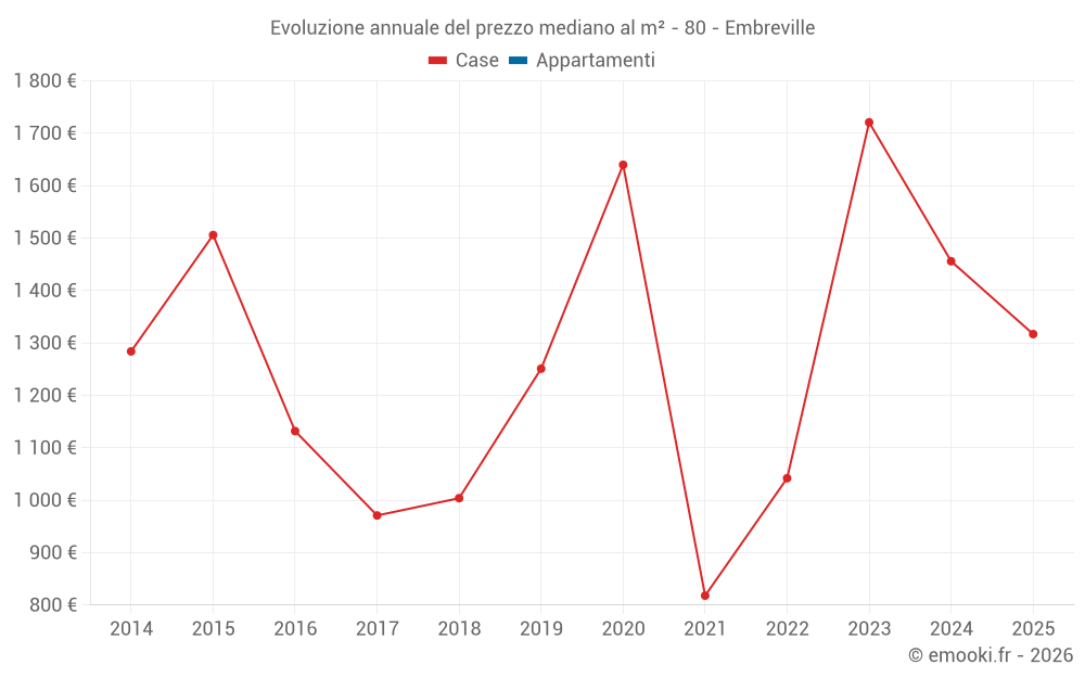Il prezzo mediano sulle 17 transazioni di case degli ultimi 24 mesi nel comune di Embreville era di 1 427 € al metro quadrato per un valore patrimoniale mediano di 125 000 €. In questo periodo il 60% delle transazioni era tra 1 108 e 1 698 € al metro quadrato (dal 2° all'8° decile).