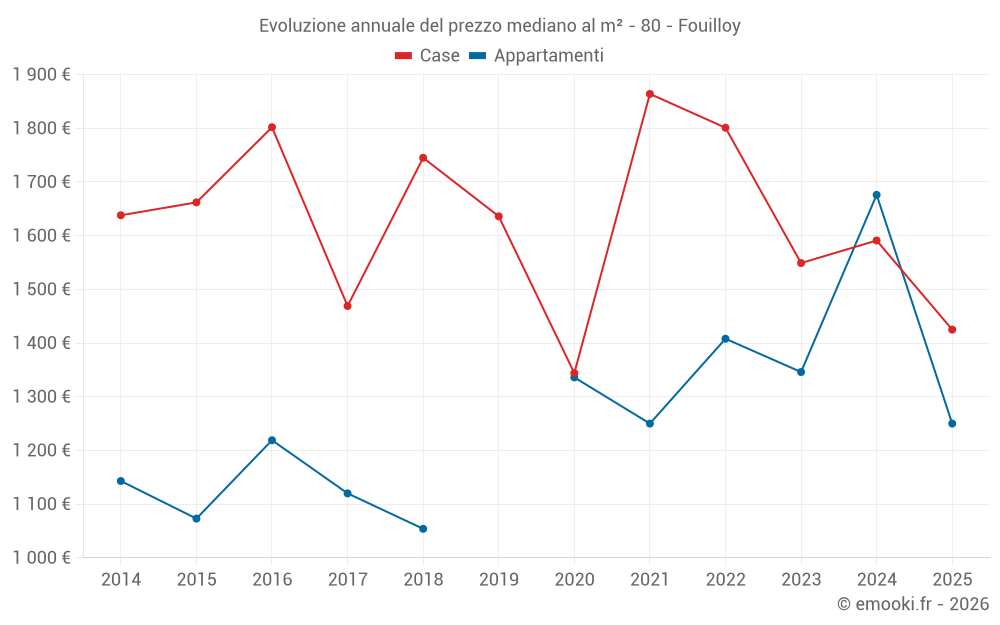 Il prezzo mediano sulle 19 transazioni di case degli ultimi 12 mesi nel comune di Fouilloy era di 1 591 € al metro quadrato per un valore patrimoniale mediano di 137 500 €. In questo periodo il 60% delle transazioni era tra 1 385 e 2 121 € al metro quadrato (dal 2° all'8° decile).