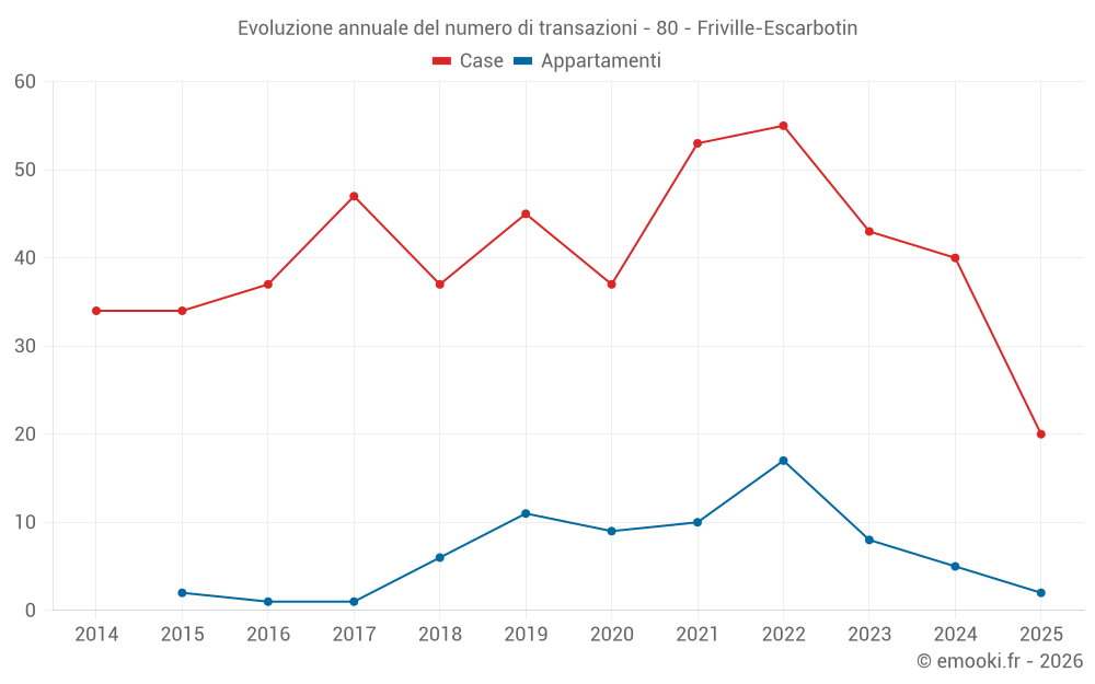 Il prezzo mediano sulle 20 transazioni di case degli ultimi 6 mesi nel comune di Friville-Escarbotin era di 1 376 € al metro quadrato per un valore patrimoniale mediano di 121 700 €. In questo periodo il 60% delle transazioni era tra 1 022 e 1 776 € al metro quadrato (dal 2° all'8° decile).