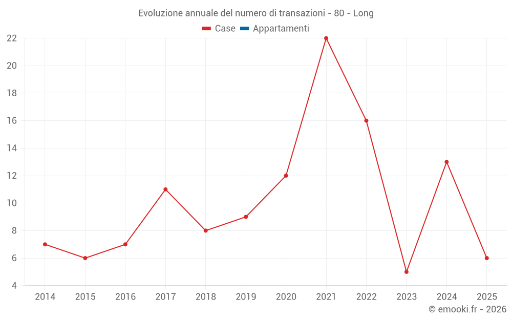 Il prezzo mediano sulle 23 transazioni di case degli ultimi 24 mesi nel comune di Long era di 877 € al metro quadrato per un valore patrimoniale mediano di 68 000 €. In questo periodo il 60% delle transazioni era tra 435 e 1 416 € al metro quadrato (dal 2° all'8° decile).
