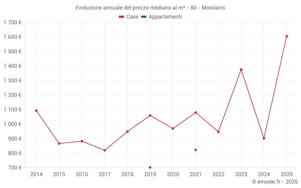 Il prezzo mediano sulle 29 transazioni di case degli ultimi 24 mesi nel comune di Moislains era di 1 231 € al metro quadrato per un valore patrimoniale mediano di 88 800 €. In questo periodo il 60% delle transazioni era tra 728 e 1 686 € al metro quadrato (dal 2° all'8° decile).