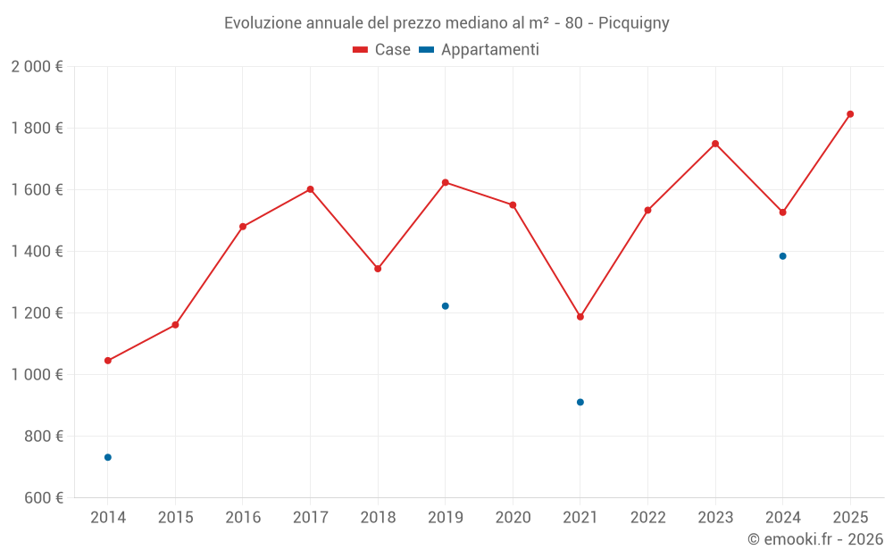 Il prezzo mediano sulle 25 transazioni di case degli ultimi 24 mesi nel comune di Picquigny era di 1 635 € al metro quadrato per un valore patrimoniale mediano di 145 500 €. In questo periodo il 60% delle transazioni era tra 1 044 e 1 950 € al metro quadrato (dal 2° all'8° decile).