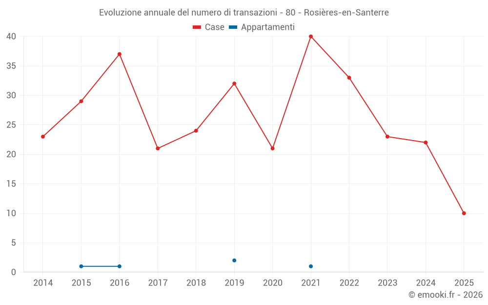 Il prezzo mediano sulle 27 transazioni di case degli ultimi 12 mesi nel comune di Rosières-en-Santerre era di 1 506 € al metro quadrato per un valore patrimoniale mediano di 123 470 €. In questo periodo il 60% delle transazioni era tra 1 210 e 1 830 € al metro quadrato (dal 2° all'8° decile).