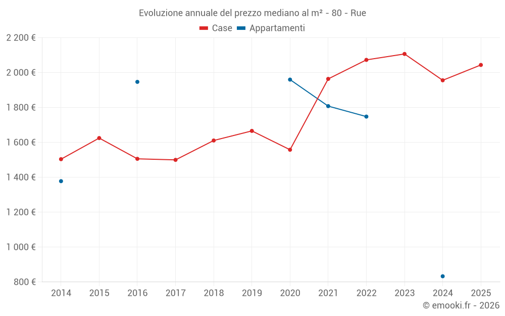 Il prezzo mediano sulle 44 transazioni di case degli ultimi 12 mesi nel comune di Rue era di 2 004 € al metro quadrato per un valore patrimoniale mediano di 186 500 €. In questo periodo il 60% delle transazioni era tra 1 236 e 2 721 € al metro quadrato (dal 2° all'8° decile).