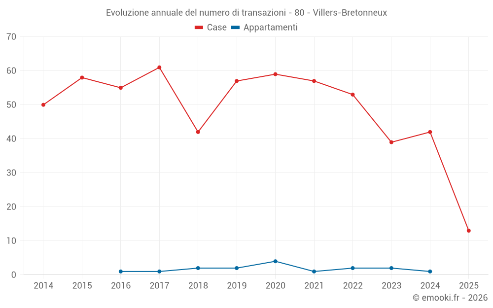 Il prezzo mediano sulle 40 transazioni di case degli ultimi 12 mesi nel comune di Villers-Bretonneux era di 1 848 € al metro quadrato per un valore patrimoniale mediano di 170 700 €. In questo periodo il 60% delle transazioni era tra 1 247 e 2 498 € al metro quadrato (dal 2° all'8° decile).