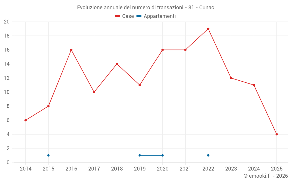 Il prezzo mediano sulle 23 transazioni di case degli ultimi 24 mesi nel comune di Cunac era di 1 875 € al metro quadrato per un valore patrimoniale mediano di 186 900 €. In questo periodo il 60% delle transazioni era tra 1 166 e 2 228 € al metro quadrato (dal 2° all'8° decile).