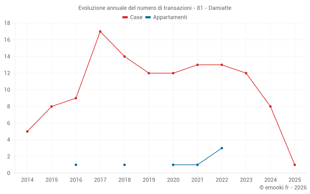 Il prezzo mediano sulle 18 transazioni di case degli ultimi 24 mesi nel comune di Damiatte era di 2 068 € al metro quadrato per un valore patrimoniale mediano di 198 950 €. In questo periodo il 60% delle transazioni era tra 1 571 e 2 554 € al metro quadrato (dal 2° all'8° decile).
