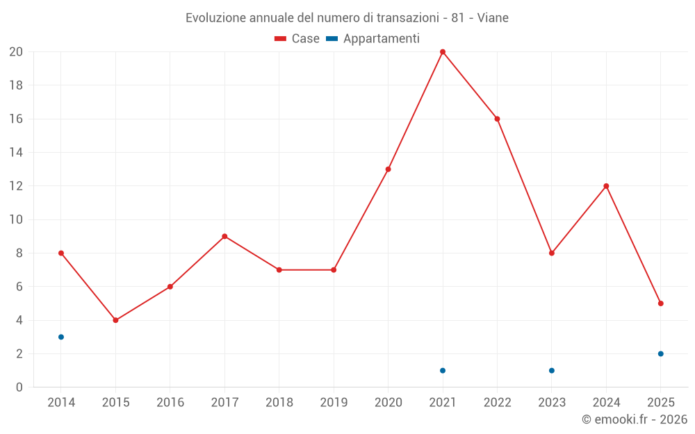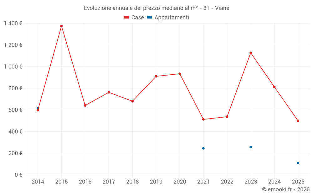 Il prezzo mediano sulle 24 transazioni di case degli ultimi 24 mesi nel comune di Viane era di 882 € al metro quadrato per un valore patrimoniale mediano di 59 122 €. In questo periodo il 60% delle transazioni era tra 420 e 1 215 € al metro quadrato (dal 2° all'8° decile).