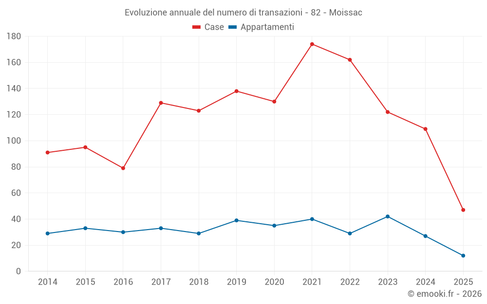 Il prezzo mediano sulle 23 transazioni di case degli ultimi 3 mesi nel comune di Moissac era di 1 374 € al metro quadrato per un valore patrimoniale mediano di 145 000 €. In questo periodo il 60% delle transazioni era tra 966 e 1 756 € al metro quadrato (dal 2° all'8° decile).