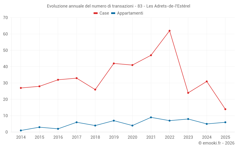 Il prezzo mediano sulle 36 transazioni di case degli ultimi 12 mesi nel comune di Les Adrets-de-l'Estérel era di 4 670 € al metro quadrato per un valore patrimoniale mediano di 646 600 €. In questo periodo il 60% delle transazioni era tra 3 701 e 6 955 € al metro quadrato (dal 2° all'8° decile).