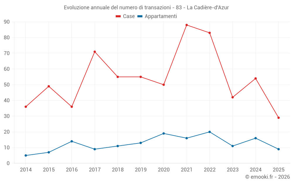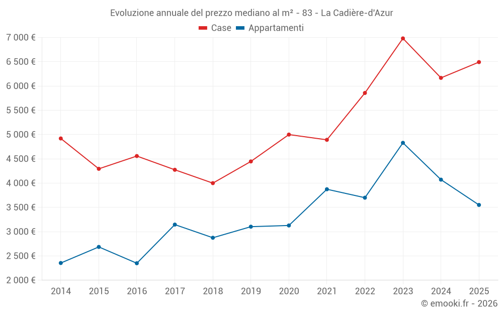 Il prezzo mediano sulle 29 transazioni di case degli ultimi 6 mesi nel comune di La Cadière-d'Azur era di 6 493 € al metro quadrato per un valore patrimoniale mediano di 900 000 €. In questo periodo il 60% delle transazioni era tra 5 076 e 7 938 € al metro quadrato (dal 2° all'8° decile).