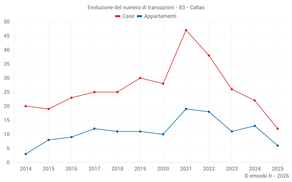 Il prezzo mediano sulle 24 transazioni di case degli ultimi 12 mesi nel comune di Callas era di 3 097 € al metro quadrato per un valore patrimoniale mediano di 334 150 €. In questo periodo il 60% delle transazioni era tra 2 412 e 3 712 € al metro quadrato (dal 2° all'8° decile).