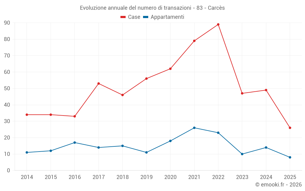 Il prezzo mediano sulle 26 transazioni di case degli ultimi 6 mesi nel comune di Carcès era di 2 931 € al metro quadrato per un valore patrimoniale mediano di 223 000 €. In questo periodo il 60% delle transazioni era tra 2 214 e 3 981 € al metro quadrato (dal 2° all'8° decile).