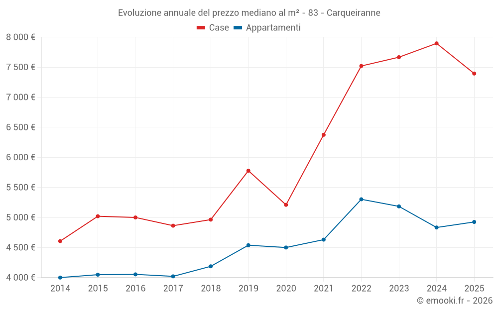 Il prezzo mediano sulle 24 transazioni di appartamenti degli ultimi 3 mesi nel comune di Carqueiranne era di 5 024 € al metro quadrato per un valore patrimoniale mediano di 280 500 €. In questo periodo il 60% delle transazioni era tra 3 891 e 5 726 € al metro quadrato (dal 2° all'8° decile).