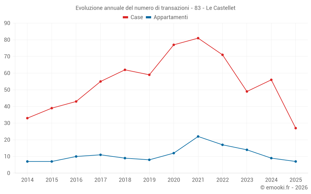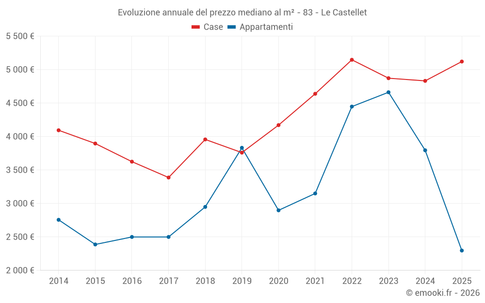 Il prezzo mediano sulle 27 transazioni di case degli ultimi 6 mesi nel comune di Le Castellet era di 5 121 € al metro quadrato per un valore patrimoniale mediano di 350 000 €. In questo periodo il 60% delle transazioni era tra 3 800 e 5 900 € al metro quadrato (dal 2° all'8° decile).